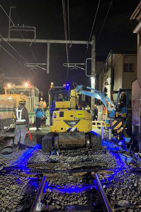夜間の重機の危険の領域が明確になることによる災害防止は良い。立入禁止の意味は写真からすぐうかがえた。夜間作業においても、一目で危険区域が分かるように工夫されている。視覚に訴える効果的な手法だと思う。
