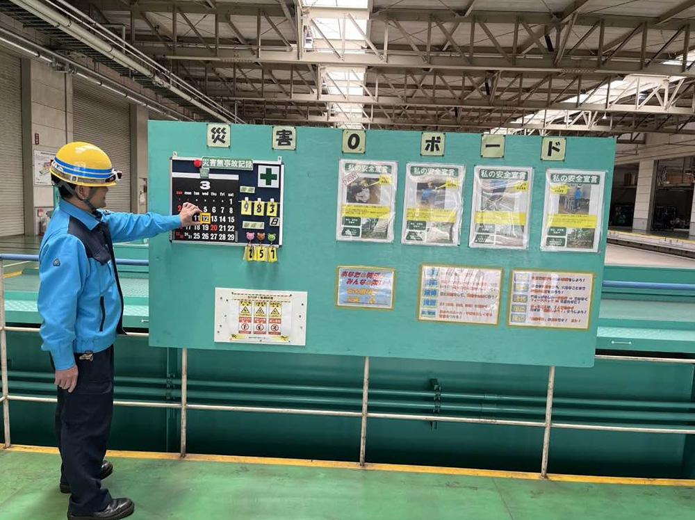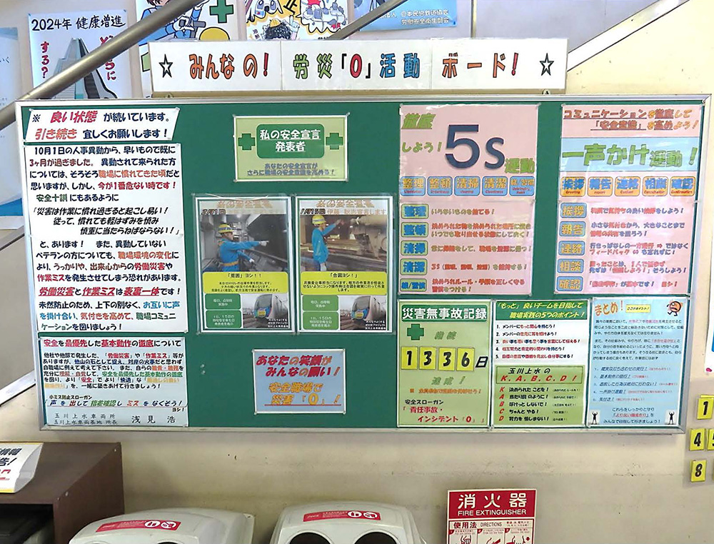 個々人の安全宣言と無災害時間により管理されている点は良い。いろいろ張り紙をしているが、内容は凡庸である。すっきりして見やすい掲示板ではあるが、内容にあまり工夫が感じられなかった。ボードでメッセージを伝えることは効果的だと思われる。