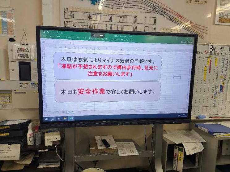 既存のPCとモニターによって注意喚起ができている。「安全作業でよろしくお願いします」の表示がされているが、表現名があいまいで心を打たない。その日ごとにテーマを設けることは評価できるが、モニター周辺の4Sがもう少し進むと良いと感じた。見える化する取り組みとして大型モニターを使用する工夫はよい。