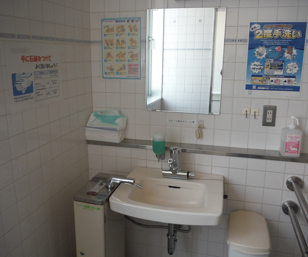 直接的に安全衛生意識の向上につながりうるものではないと思いますが、ハードの対策で衛生保持を図っている点は評価できます。衛生面から手を触れないことは良い取組みであり、設備投資も含めて良好といえる事例。掲示物がきれいな状態が保たれていて、見やすい位置に掲示されていて評価できる。全体的に清潔な印象をもった。つめブラシの「泡だつ石鹸湧き立つ心」のキャッチコピーがよく、意識を高める工夫がされている。