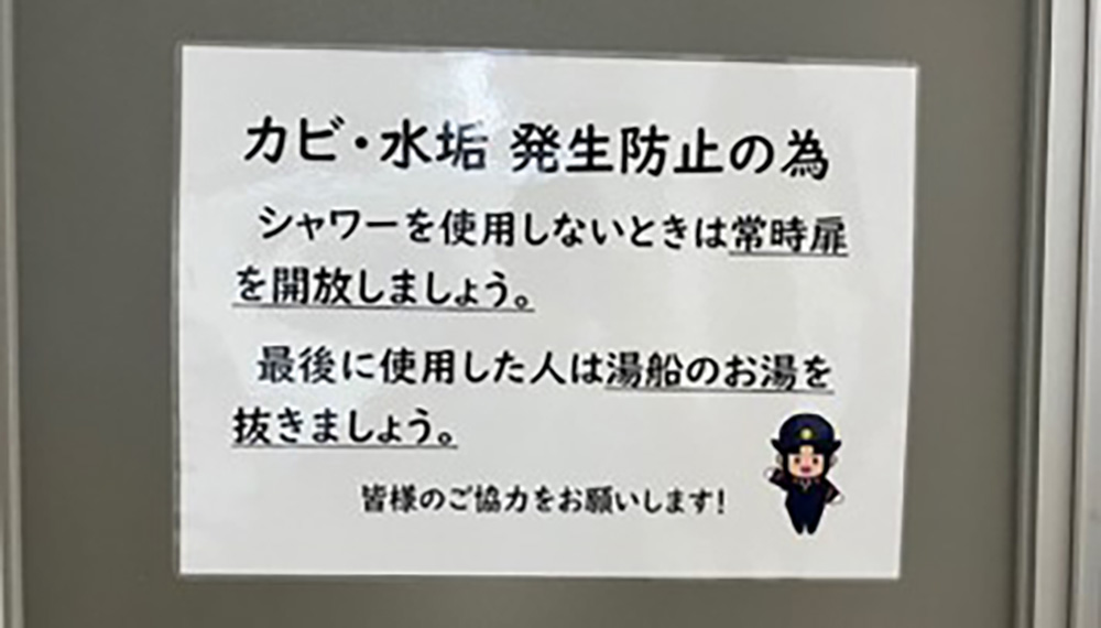 掲示場所に多少の工夫は見られますが、内容としてはありきたりな感じがします。浴室の衛生管理に有用であると思われるが、レイアウトが不明であるがシャワー室の扉開放による問題が生じないか懸念される。分かりやすい掲示であるが、あまり工夫が感じられなかった。