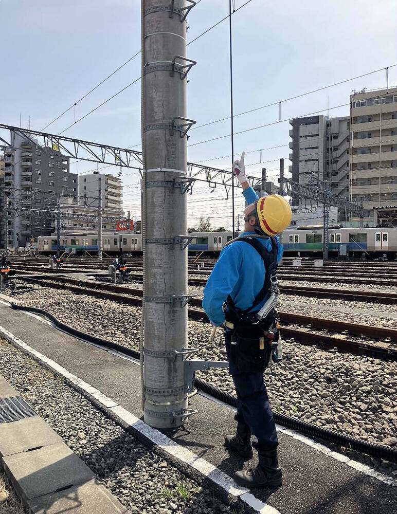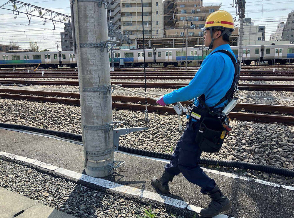 墜落制止器具を使用した踏切警報機の点検